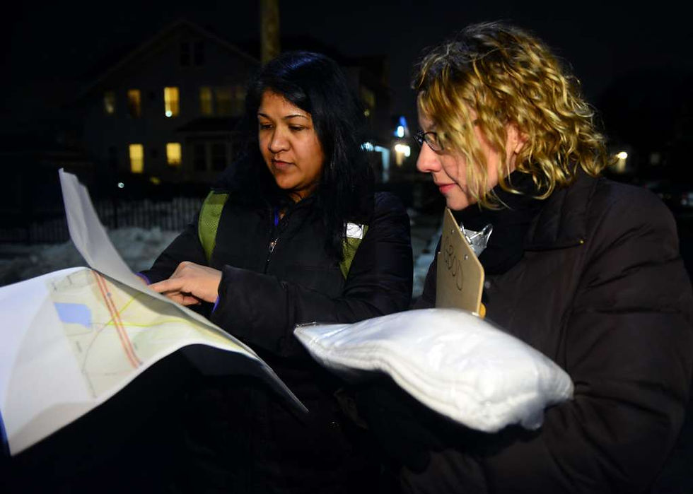 Volunteers Lisa Bahadosingh and Cathy DiTuri, right, stop to check the map as they take part in the annual Point-in-Time count in 2016. Photo: Connecticut Post